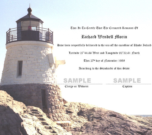 • Unattended, We provide a respectful, dignified sea scattering service locally in the Atlantic Ocean. We depart port from Narragansett Bay area and travel west a minimum distance of 3 miles as required by US Code. Following the scattering, we will place flowers on the water to mark the spot. We record the exact longitude & latitude coordinates which are provided to you in the form of a certificate suitable for framing. If you wish to attend, Private Charters may also be arranged for an additional fee. Please inquire for current pricing.